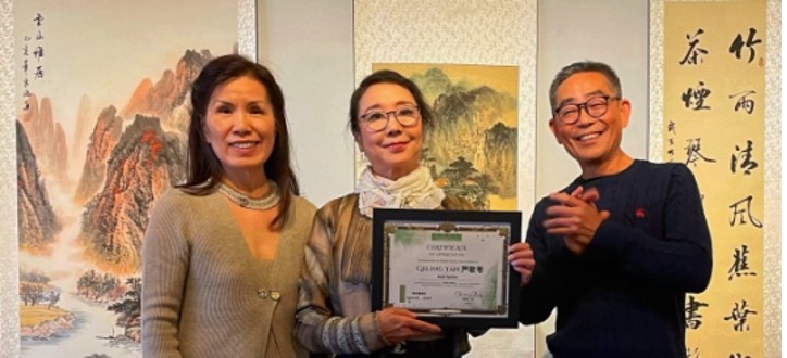 半杯清茶社社长张晓榕,前社长许之微为严歌苓颁发感谢状