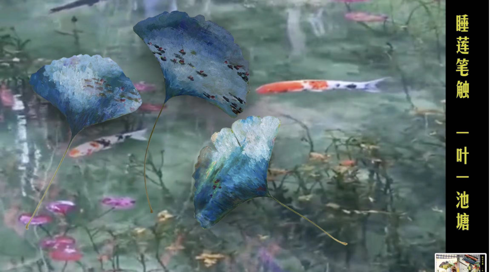 【一叶一池塘】2019年在巴黎橘园美术馆见到了全景式画布上的《睡莲》,陈颍认为这是西方大师创作的一幅很接近东方绘画精神的作品,开始尝试以莫奈《睡莲》的笔触去创作:油彩、光和影的艺术。塘中带有莫奈意境的银杏叶子,是Photoshop上去的。陈颍对后期处理的艺术效果非常满意。