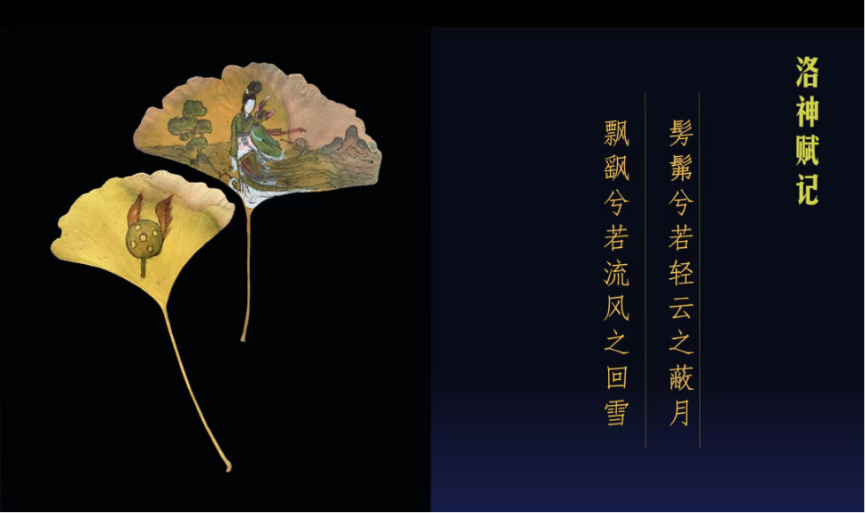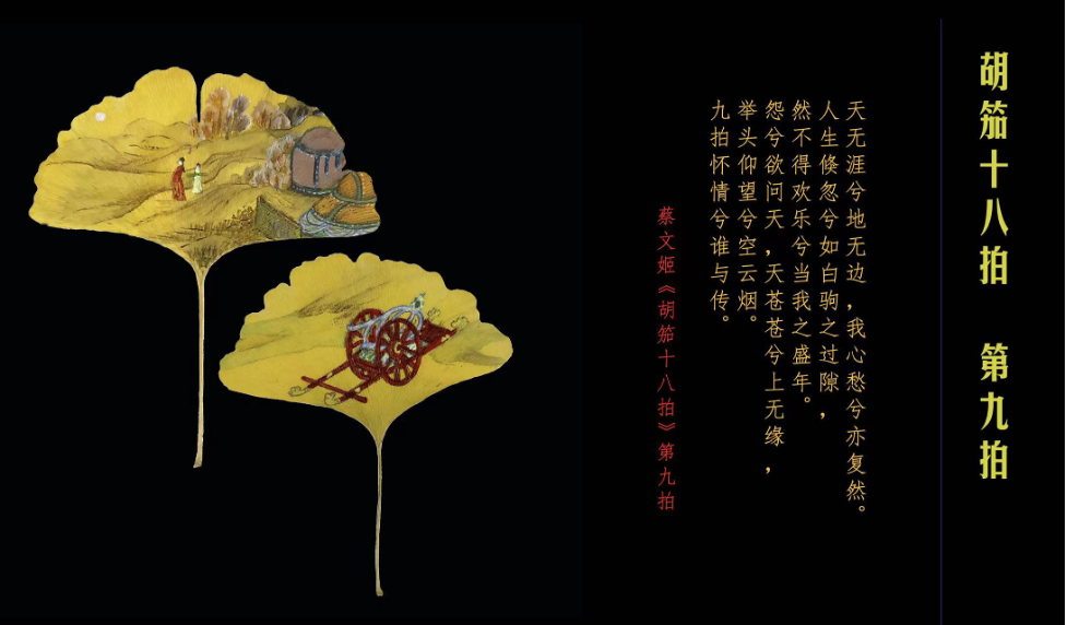 【胡茄十八拍】享有中国十大名曲之一的《胡茄十八拍》,据传其作者是兼具音乐及文学天赋的蔡文姬。这套琴曲歌辞以“文姬归汉”为主题,是蔡文姬本人在由匈奴重返故土的途中,悲喜交集,感慨万千,借用当地的胡茄音调创作的。一章为一拍, 共18章。将歌辞中的意境呈现在银杏叶上,这种辞画转换是一个再创作的过程。