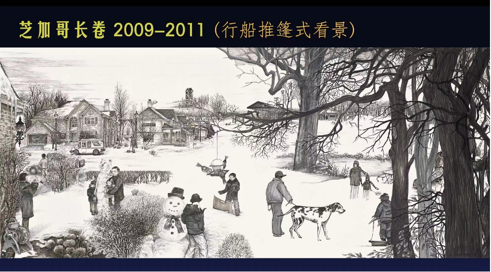 不同凡响的《芝加哥长卷》由20 多幅画组成,近10米长。《芝加哥长卷》描绘了陈颍一家人在芝加哥漫长的冬天里活动的场景。下图是《芝加哥长卷》中的一幅。这个有着中国画长卷影子的创作,在陈颍看来,是潜意识里的国画情节在发力,与她幼时的国画书法训练和耳闻目染的文化熏陶是息息相关的。
