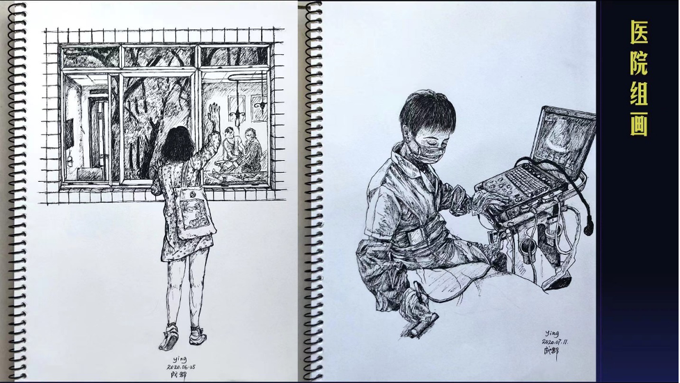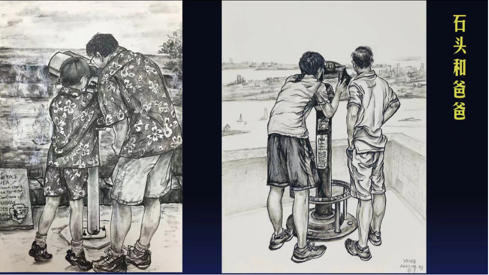 从成都到合肥,从合肥到芝加哥,从芝加哥到北京,从北京到加州······ 陈颍在人生的道路上,经历过各种变化,但始终没有离开艺术。她以观察者的眼睛看生活,以艺术家的笔墨记录生活。生活给她带来了很多的灵感和绘画的题材。她说,当以观察者的身份创作时,她会变得更包容,不再抱怨生活中的种种不如意,生活变得更加有情趣。生活处处有艺术,艺术把生活点亮。陈颍的作品素材大多来自现实生活场景和记忆,她会以不同的绘画方式来留住那些美好的瞬间。就像墨竹成就了银杏叶画系列,芝加哥的生活经历成就了钢笔画《芝加哥长卷》,孩提时代的儿子与父亲聚少离多的生活场景成就了《石头和爸爸100个瞬间》,在医院照顾父亲的那些日子成就了《医院组画》······。