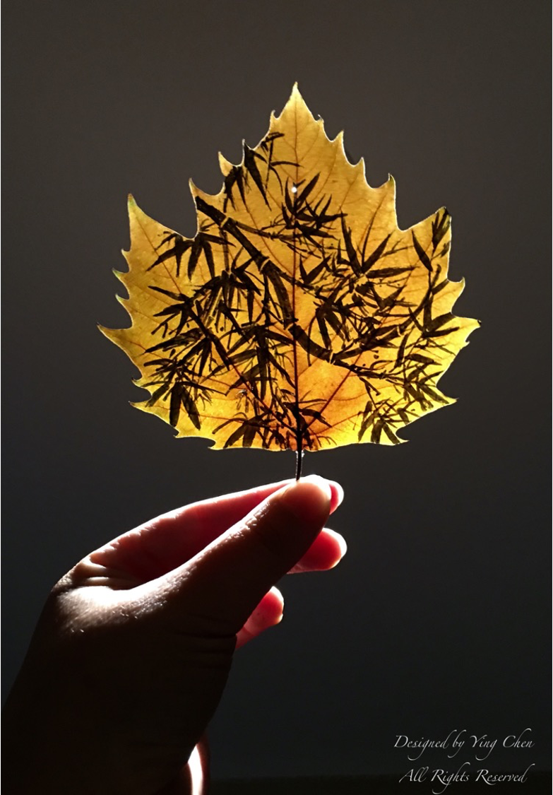 2015年,一个秋天的下午, 陈颍去学校接孩子。在校园偶然拾起几片银杏叶,习惯地用碳素墨水笔随意勾画起来。简单的线描图案,加上银杏叶独有的形态和色彩,呈现出一种有趣的视觉效果。这让陈颍兴奋不已!虽然对银杏叶很熟悉,但是那天与银杏叶的 “邂逅” ,将她的 “画笔” 从梧桐叶搬到了银杏叶。