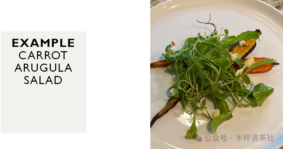 这道菜味型的基本要素是:甜(胡萝卜)、苦(芝麻菜)、酸(柠檬汁)、咸(咸奶酪)。