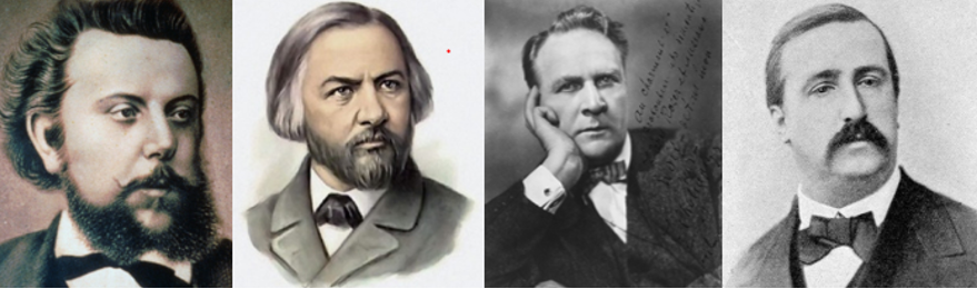 从左至右:穆索尔斯基,格林卡,夏里奥平,鲍罗庭