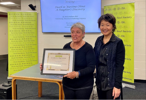 从中国回来后,朱迪决定用自己曾经写公文的笔,记录下比尔的生平和她的寻亲之旅,于2022年正式出版了《殉难于抗战中的中国:一个女儿的发现》(Death in Wartime China: A Daughter's Discovery)。在扉页,华府知名书法家王纯杰教授题写了中文“父亲 英雄 莫忘”,用遒劲有力的中国传统书法道出了这本书带给读者的共同感受。