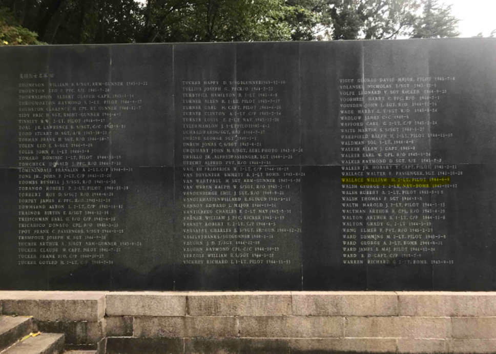 着色处为南京航空烈士公墓纪念墙上比尔的姓名、军衔和牺牲日期