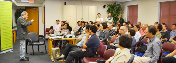 最后,王康先生还谈到了展览准备活动中出现的一些感人花絮。得知王康先生即将只身前往纽约布置10月的展出,多位半杯会员当场捐助以壮行色。王康曾经说过,"浩画的赞助者是木匠,是生死与之的高人、义士!我们不敢自诩"得道多助",但《浩》画确实劳师动众,几乎无远弗届。"他也希望画卷的展出和纪念抗战胜利七十周年的活动能有助于国共两党的合作和两岸的和平。讲座结束时,王康先生向半杯清茶社赠送了重达36斤的《浩气长流》缩印本。半杯清茶社将在以后的讲座活动中,持续展示《浩气长流》。在欣赏这部举世无双的艺术作品的同时,也表达我们对抗日英烈和巨画创作者们的崇高敬意。