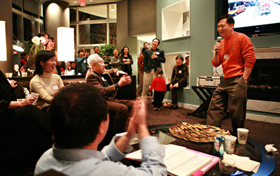 半杯社的成员来自两岸三地,四面八方,学习和工作经历各异, 但是,大家本着"以茶清心,以文会友"和提升精神生活品质的共同愿望,每月举办讲座、沙龙,分享读书和生活心得,期以开阔视野,丰富阅读经验, 提升心灵境界。在这次的节日聚会中,人们愉快叙谈 ,并细细品尝美味的家庭自制餐点和各式酒类,还有友人现场制作鸡尾酒同乐, 与会人士带来的各地珍品茗茶也为"半杯清茶社"的晚会添上了阵阵的清香和浓浓的茶趣。 晚会上,有人静静地下着古老的中国象棋, 一群年青人则“奋力”地在大屏幕电视前玩起最新版本的Wii体育游戏,更多的人在悦耳悠扬的音乐声中敞开心扉,一展歌喉,中外名曲,经典老歌, 令人精神焕发,思绪飞扬。晚会由"半杯社"会员崇艺农主持,她邀请刚从国内回来的朋友同她一起与大家分享在国内的有趣经历和见闻,曹鉴钦,路阳,贾立斌,何苗壮, 崇艺农等分别以各自的经历畅谈了回国观感,才情卓越的刘渊、罗刚、路阳、张振生、倪凡等则以动人的歌声和风趣的相声小品为大伙助兴, 妙趣横生,引来阵阵热烈的掌声和会心的笑声。胡宏的歌唱、话剧和小品节目在华府远近闻名,晚会上他机智幽默的言谈和诙谐逗趣的自创小品, 令大家捧腹不止,连声称绝。事实上,当晚典雅亮丽 、设施一流的二十二层顶楼晚会场地就是由胡宏和好友郑莹一家所提供的便利。张伊立在晚会上还向大家介绍了有关将在明年四月举办的"爱心音乐会"的筹备情况。朱虹三岁大的女儿Sophia ,天性活泼可爱,是中西爱情的结晶, 也是"半杯"晚会上的小开心果。漂亮的Sophia 在晚会上为大家表演唱歌还背诵了唐诗,字正腔圆,赢得满堂的喝彩。作为节日的贺品, 张振生为晚会提供了许多精致的礼品,小Sophia 还兴奋地同崇艺农一起为大家进行抽奖活动, 小孩充满童趣童真的言行举止让大人们忍俊不禁,开怀大笑。